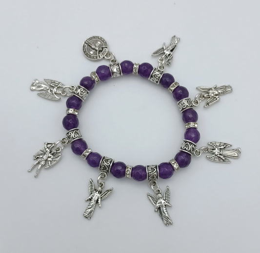 Seven Archangels and St Benedict stretchy charm bracelet in pewter with genuine stones