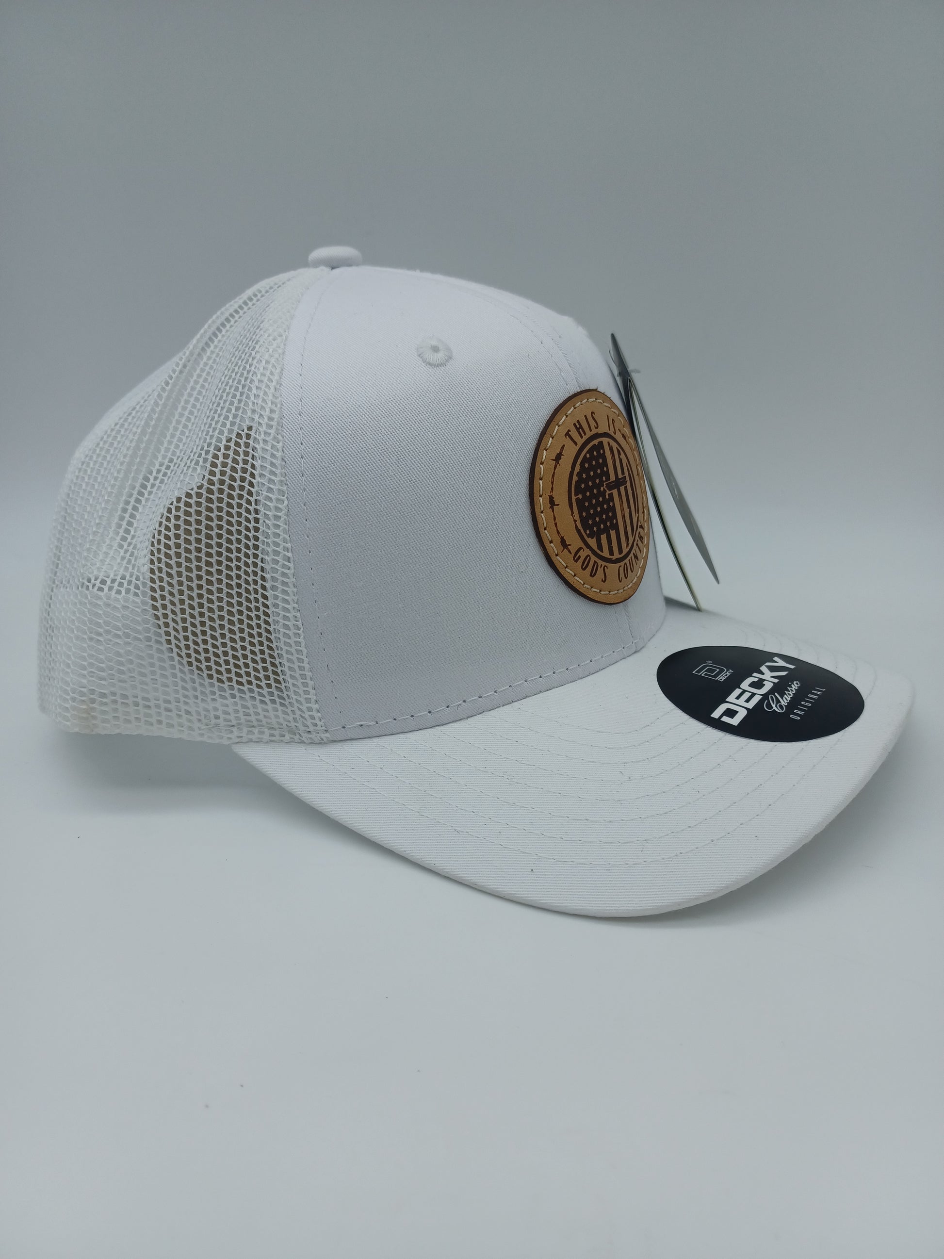 This design features an American Flag and a Cross encircled in Barbed Wire and the words "This Is God's Country". The image is Laser etched onto a 2.25 inch circle leather patch. Our patches are 100% vegetable-tanned cowhide that are sewn onto the hat.